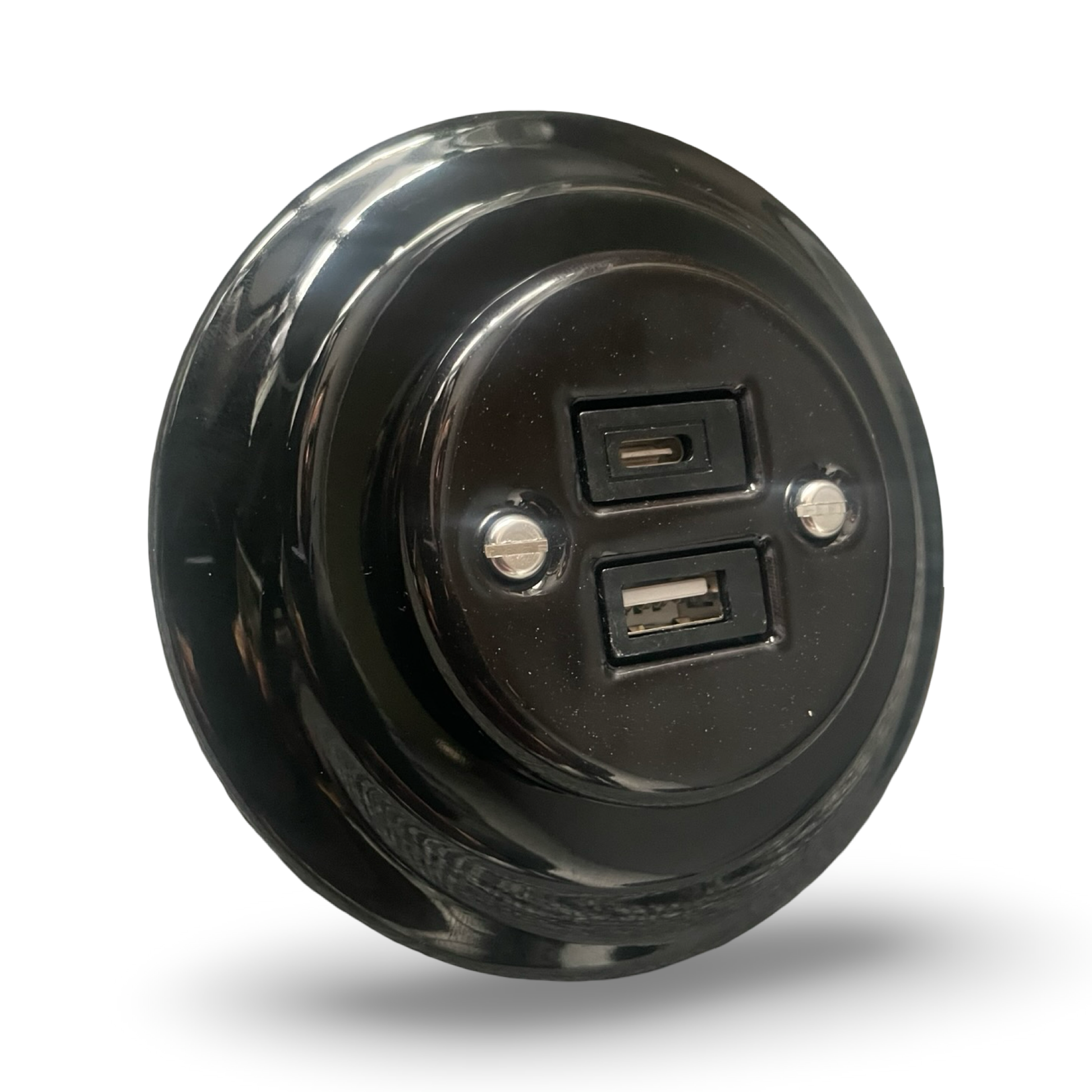 CE Certified Polished Black flush mounted porcelain USB Charging Point. Retro Vintage design perfectly fits any interior - from Home - Business. It's made with high quality porcelain and finished in a beautiful White ceramic glaze. Go back in time with these vintage porcelain light fittings.